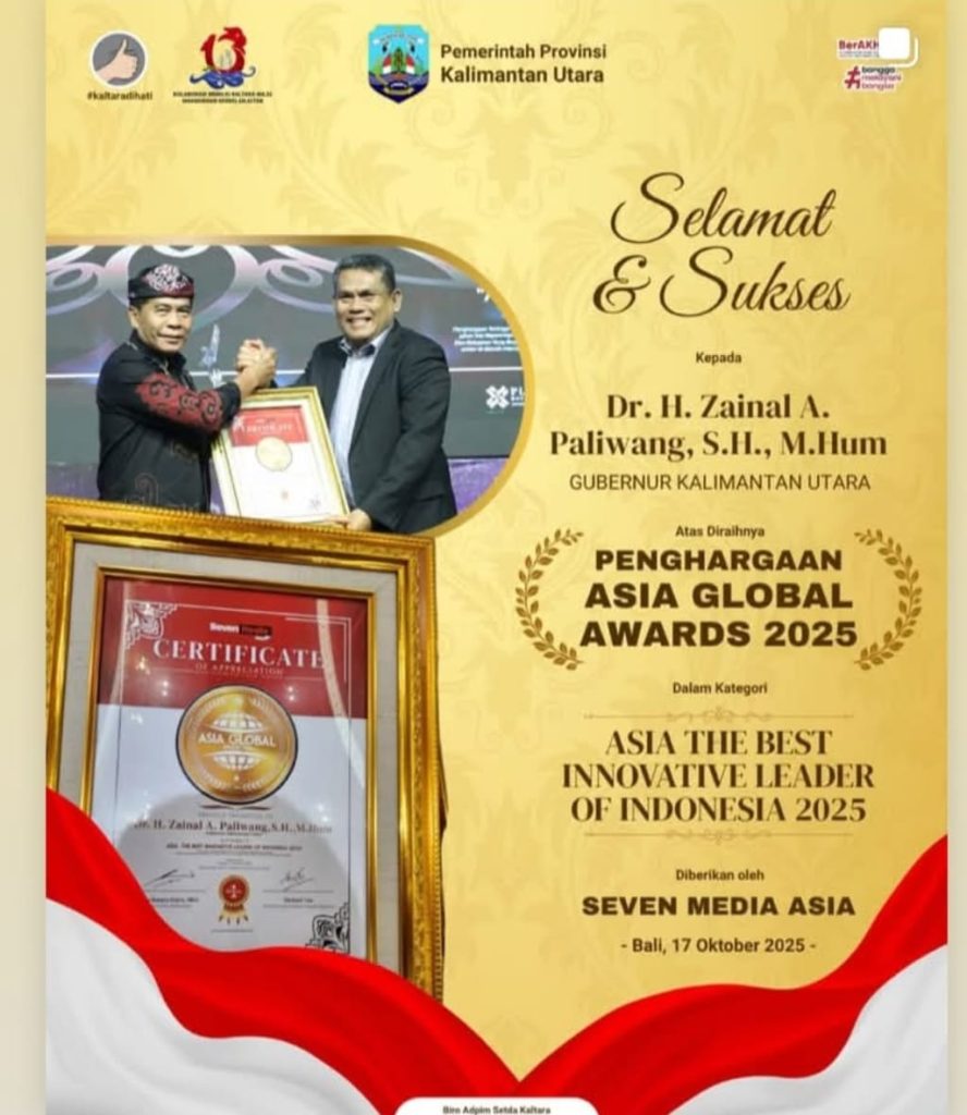 Bali, Minggu 20/10/2025// KARYAcelebes.com – Prestasi gemilang yang membanggakan seluruh masyarakat Bumi Benuanta lagi-lagi ditorehkan oleh Gubernur Kalimantan Utara (Kaltara), Dr. H. Zainal Paliwang, SH, M.Hum yang kembali mendapatkan penghargaan dari Seven Media Asia dalam ajang spektakuler bertajuk “Asia Global Awards 2025” dalam kategori “Asia The Best Innovative Leader Of Indonesia 2025”.