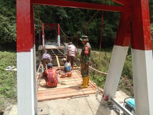 Adapun tahapan pekerjaan meliputi pengecoran pondasi dan blok beton di sisi tepi dekat, pembuatan mal foot plat, perakitan besi, pengecoran foot plat, serta proses pengecatan. Saat ini, jembatan gantung tersebut telah rampung 100 persen dan sudah dapat dimanfaatkan oleh masyarakat.