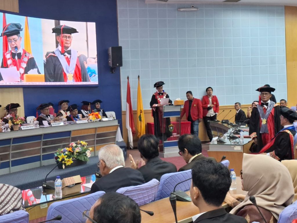 “Di era digital, stabilitas tidak lagi hanya soal kurs atau inflasi tetapi juga soal keamanan jaringan, keandalan data, dan kepercayaan publik terhadap sistem moneter baru,” tandasnya lalu mengakhiri pidato ilmiahnya dengan menyapa dan mengucapkan terima kasih kepada seluruh keluarga dan kerabat dekatnya yang telah hadir menyaksikan momen perjalanan akademiknya.