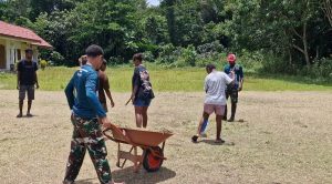 Satgas Pamtas RI–PNG Yonif 763/SBA Pos Suswa melaksanakan kegiatan kerja bakti bersih-bersih gereja bersama Pemuda dan pemudi di Kampung Suswa, Distrik Mare, Provinsi Papua Barat Daya, sebagai bentuk kepedulian terhadap lingkungan sekaligus mempererat hubungan dengan warga di wilayah perbatasan. (4/4/2026).