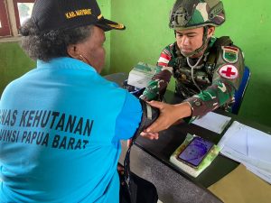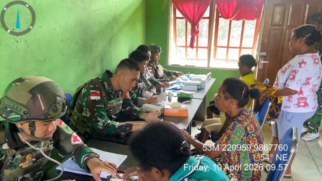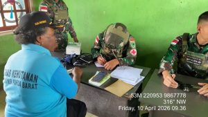 Satgas Pamtas Kewilayahan RI-PNG Yonif 763/SBA Pos Bori bersama Dokter Satgas Yonif 763/SBA melaksanakan kegiatan pengobatan massal dan pengecekan kesehatan gratis di Pustu Bori Kampung Bori Distrik Aifat Kabupaten Maybrat, Provinsi Papua Barat Daya, (13/4/2026). Langkah ini diambil sebagai bentuk kepedulian terhadap warga setempat yang memiliki keterbatasan akses menuju fasilitas kesehatan permanen yang lokasinya cukup jauh dari Kampung Bori.