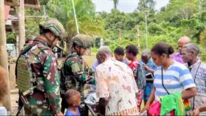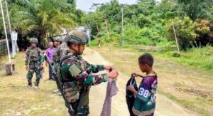 Anggota Pos Subin melaksanakan kegiatan pembagian pakaian layak pakai kepada masyarakat, khususnya orang tua dan anak-anak di sekitar wilayah Subin, Papua.