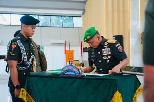 Pangdam XIV/Hasanuddin Mayjen TNI Bangun Nawoko memimpin Serah Terima Jabatan (Sertijab) Asrendam XIV/Hsn dari Kolonel Inf Abi Kusnianto kepada Kolonel Kav Robinson Octavianus B., S.H., Aster Kasdam XIV/Hsn dari Kolonel Inf Hipni Maulana Farhan kepada Kolonel Arm Muh. Saifudin Khoiruzzamani, dan Pamen Ahli Bidang OMSP Sahli Pangdam XIV/Hsn dari Kolonel Inf Jajuli Achmad, S.Sos., kepada Kolonel Inf Saiful Parenrengi, S.Sos., M.Psi., bertempat di Balai Pertemuan Hasanuddin (BPH), Makodam, Jl. Urip Sumoharjo, Kota Makassar. Selasa, (28/4/2026).